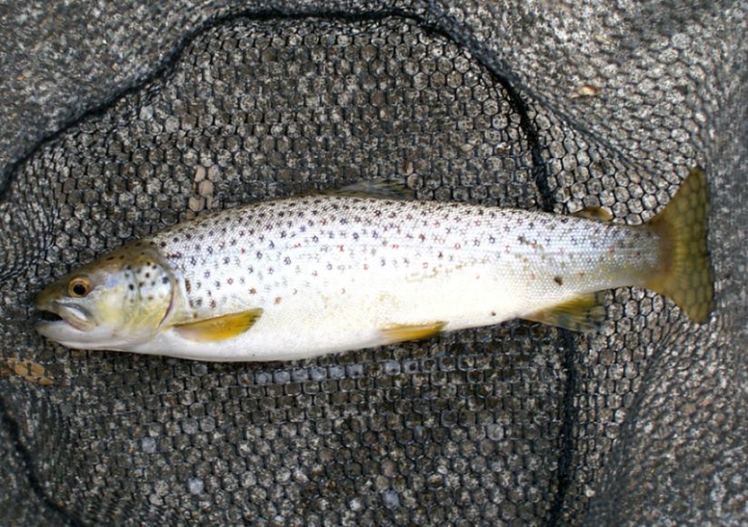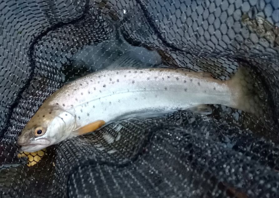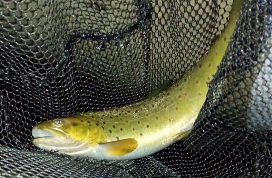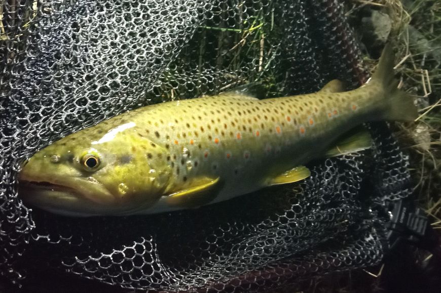 3日の雨でやや増水、濁りも入ってチャンス。ところが、初めのうちはいつも通り全く反応がなかった。夕まずめになって、スーと流れていた目印がゆっくりになってきた。いよいよ魚が動き出した。と次の一投でコツ・コツ・・・というアタリがきたが、餌だけ取られてしまった。慎重に次の一投、投入と同時にいきなり引き込む大アタリ。 ところが、右のブロック下に入られ動かなくなってしまった。しばらく待つが出る気配がない。あきらめてラインを切ろうかと思った瞬間、ブロックから出て下流へ突っ走った。激闘。苦戦したが、なんとかタモ入れ成功。39cmと引きの割に小さなブラウン。 |