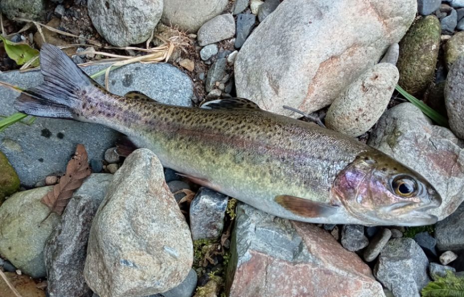 一投目からアタリが来てビックリ。しかも珍しいニジマス。以降、次々とニジマスがあがる。どうやら、マス釣り大会があったようだ。放流して間もない感じで、アタリも引きも派手で大きく感激!禁漁まで一月ということで、河原の草刈もしてあり、至れり尽くせりという感じ。ヤマメ1,ニジマス11。食べる分キープ。 |
